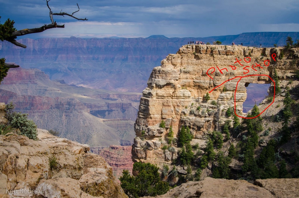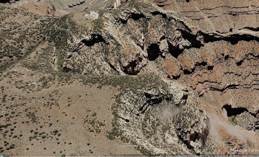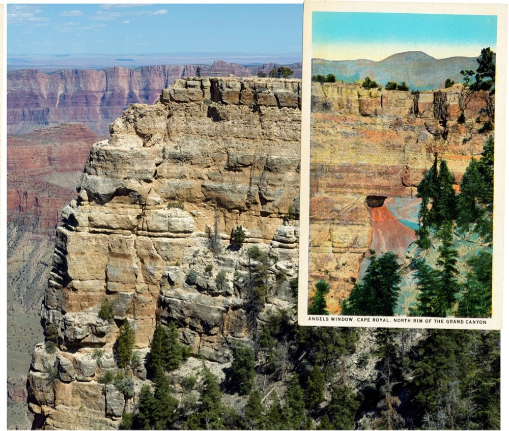 | This image appears to be a photoshop to hide the cave. Scanning this site from Google Earth shows no such through hole in the cliff face. Which is why the author of the blog mentioned earlier overlayed an old post card on the location. The way this terrain sits, you wouldn't notice it from the lookout point because it's below the parking lot. |
